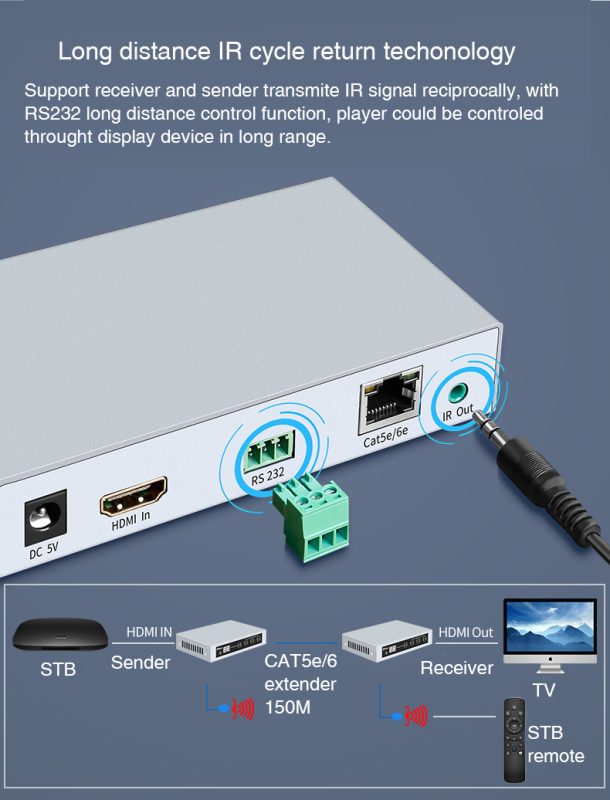 The HDMI extender supports resolution up to 1080 p @ 60 hz, you can use a set of USB1.1 keyboard and mouse to control the remote equipments. After extended with CAT5e/6, the remote image restoration effect is clear, natural and without obvious attenuation, the extension distance up to 100 meters; In addition, it support IR return function, which convenient for users to control the switch of the monitor, adjust the volume, and switch TV channels. Widely used in computer teaching system, high quality multimedia display, LCD plasma high-definition video conferencing, meter machine, display hall, digital home theater, exhibition, education, finance, scientific research, meteorology and other fields.
